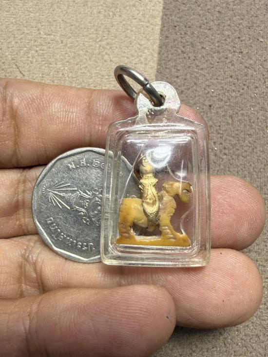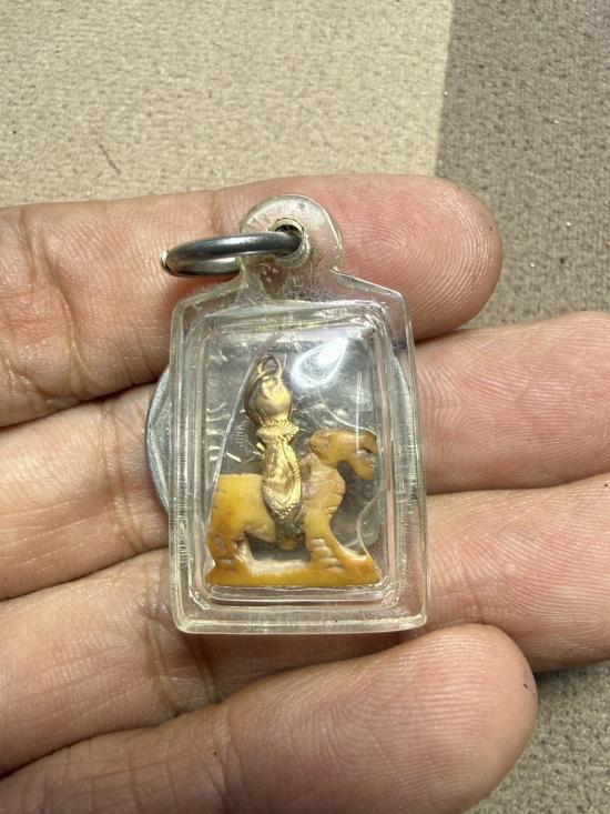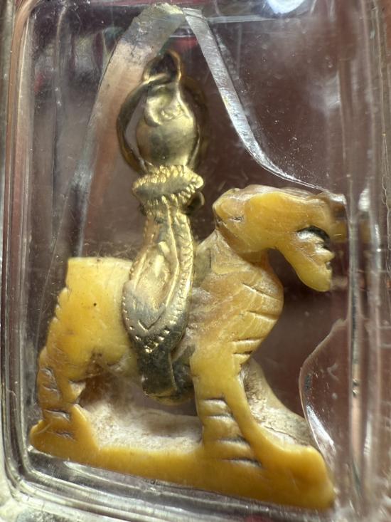 สิงห์งาแกะไม่ทราบที่ ห้อยกระเช้าทองคำแท้(ทองคำโบราณ) เลี่ยมกรอบพลาสติกกันน้ำอีกที เก่ามากครับ สภาพใช้ห่วงทองตำเกือบขาด