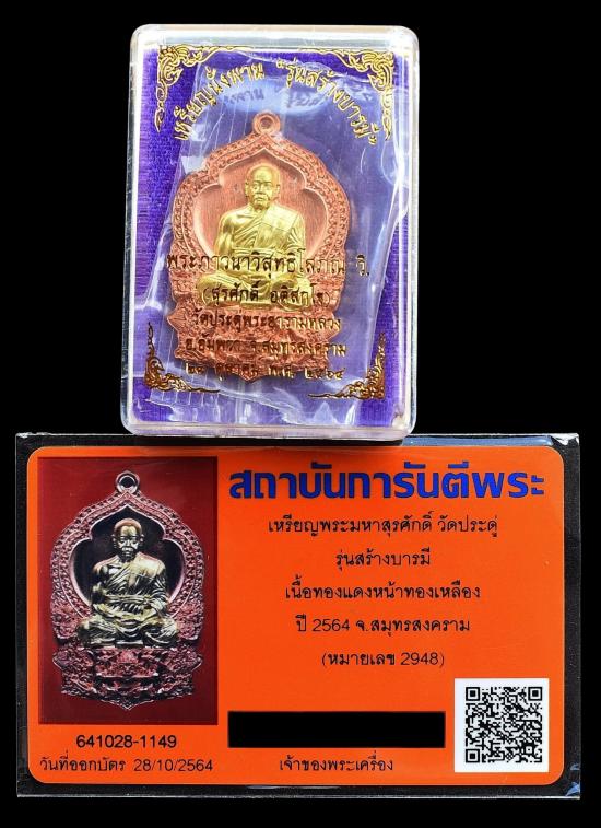 เหรียญสร้างนั่งพานบารมี เนื้อทองแดงหน้าทองเหลือง เบอร์ ๒๙๔๘ ปี 2564 หลวงพ่อพระมหาสุรศักดิ์ วัดประดู่ จ.สมุทรสงคราม พร้อมกล่อง + บัตรรับรองพระแท้การันตีพระ สภาพพระตามรูปที่ลงทุกประการ