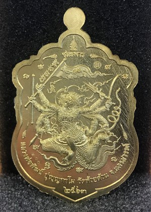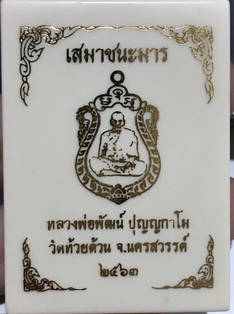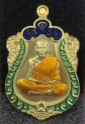 เหรียญเสมาชนะมาร หลวงพ่อพัฒน์ วัดห้วยด้วน พร้อมกล่องเดิม เนื้อทองฝาบาตรลงยาน้ำเงิน - เขียว จีวรเหลือง หมายเลข 300