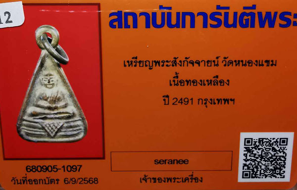 เหรียญพระสังกัจจายน์ วัดหนองแขม เนื้อทองเหลือง ห่วงเดิม ปี2491 จ.กรุงเทพฯ(หลวงพ่อรุ่ง วัดท่ากระบือ ปลุกเสก) + บัตรG-pra สภาพเดิมค่ะ |