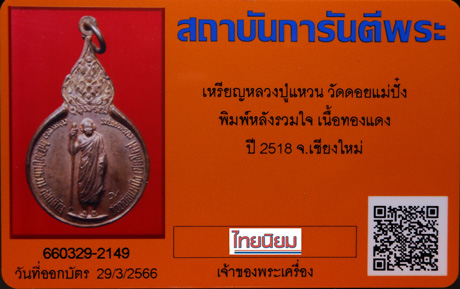 เหรียญหลวงปู่แหวน วัดดอยแม่ปั๋ง เหรียญยืนหลังรวมใจ เนื้อทองแดง พ.ศ.2518 เก็บแบบตอกโค๊ดเลข.๙ สบายใจ ชัดเจน นิยมหายาก (ส่วนมากจะพบเจอแต่หลัง ภปร.) พร้อมบัตรรับรองการันตีพระ