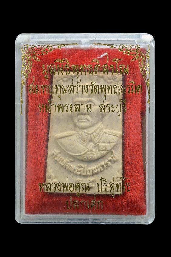 พระผงสมเด็จพระปิยะมหาราช ( ร.5 ) หลัง สมเด็จพระฒุาจารย์ ( โ ต พรหมรังสี ) ปลุกเสกโดย หลวงพ่อคูณ มูลนิธิพุทธติสรโณ สบทบท ุ นสร้างวัดพุทธเนรมิต จ.สระบุรี ไม่ทราบปีสร้าง ( กล่องเดิม )