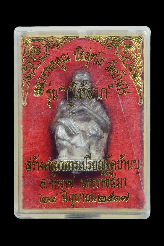 รูปหล่อเหมือนนั่งยอง ( ขนาดจัมโบ้ ฐานกว้าง 1.8 ซ.ม. , สูง 3. 5 ซ.ม. ) รุ่น กูให้ลาภ ( เนื้อโลหะชุบเงิน ) พ.ศ.2537 ( กล่อง เดิม ) ** 1 **
