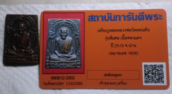 เหรียญหลวงพ่อวัดดอนตัน ปี 2519 พิมพ์ซุ้มตื้น หมายเลข 1606 จ.น่าน พร้อมบัตร ครับ