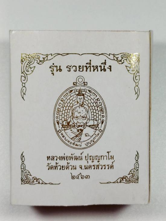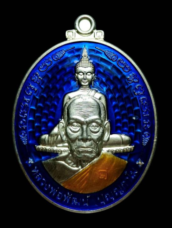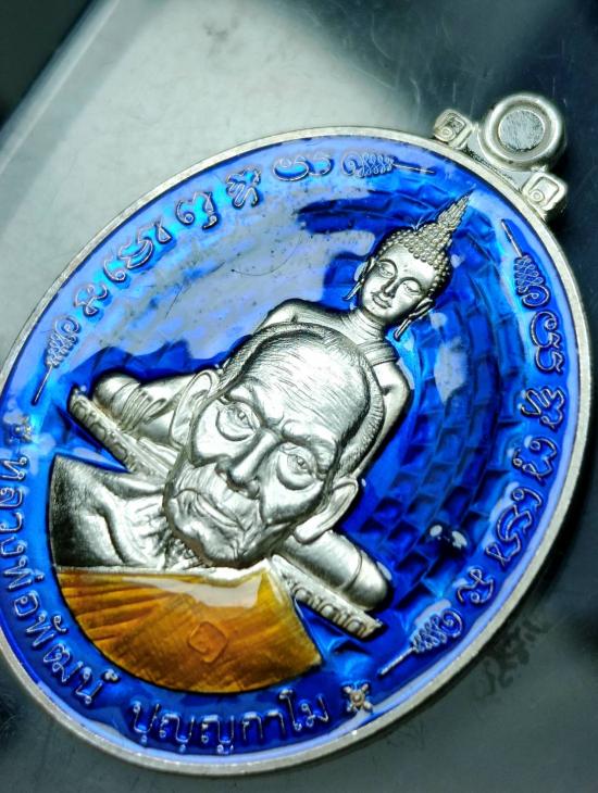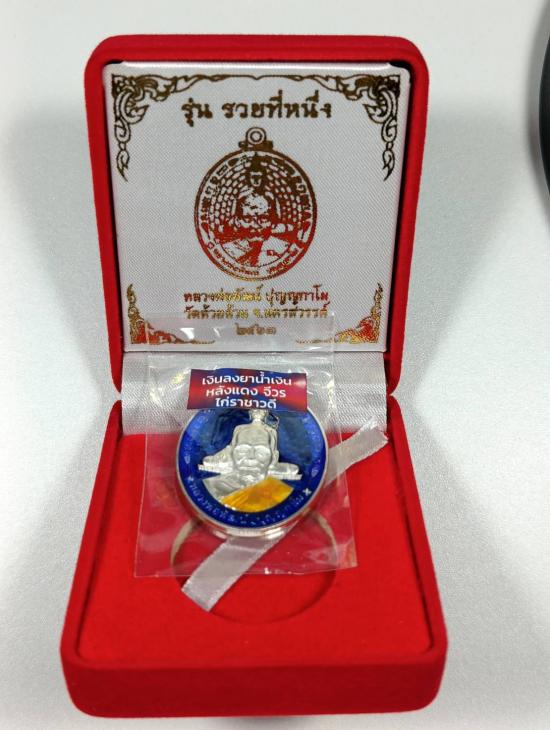 เหรียญรุ่นรวยที่หนึ่ง เนื้อเงินลงยาน้ำเงินหลังลงยาแดง หมายเลข๓ สร้างปี2563 หลวงพ่อพัฒน์ วัดห้วยด้วน พร้อมกล่องเดิมจากวัด ถอดพิมพ์มาจากเหรียญหลวงพ่อคูณ ปี2517