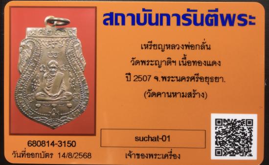 เหรียญหลวงพ่อกลั่น วัดพระญาติฯ เนื้อทองแดง ปี 2507 จ.พระนครศีอยุธยา วัดคานหามสร้าง |