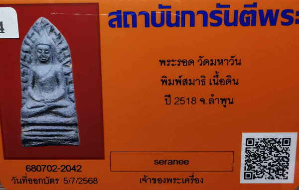 พระรอด วัดมหาวัน พิมพ์สมาธิ(มีหน้าตา) เนื้อดิน ปี2518 จ.ลำพูน + บัตรG-pra + กล่องเดิม สภาพสวยเดิมค่ะ#1 |
