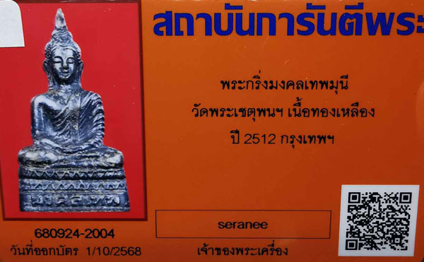 พระกริ่งมงคลเทพ วัดพระเชตุพนฯ เนื้อทองแดง ปี2512 จ.กรุงเทพฯ + บัตรG-pra สภาพเดิมค่ะ |