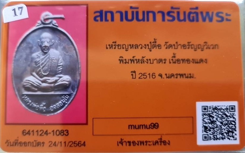 #@.. เหรียญรูปเหมือน.หลังบาตร "ลป.ตื้อ อจลธัมโม วัดป่าอรัญวิเวก บ้านข่า จ.นครพนม" กองบัญชา ทหารสูงสุด จัดสร้างถวาย. พ.ศ.2516 มีตอกโค๊ต"ต."กำกับ สภาพสวยวิ๋งๆๆ สภาพนี้หายาก..พร้อมบัตรรับรอง....แท้....ถูก..ดี..น่าเก็บมาก.........เหรียญหลวงปู่ตื้อ รุ่น พ.ศ.2516 หลวงปู่ตื้อ อจลธัมโม อดีตเจ้าอาวาสวัดป่าอรัญญวิเวก บ้านข่า ต.บ้านข่า อ.ศรีสงคราม จ.นครพนม ทั้งนี้ ก่อนจะมรณภาพ 1 ปี ในปี พ.ศ.2516 กองบัญชาการทหารสูงสุด ได้จัดสร้างวัตถุมงคลเป็น เหรียญหลวงปู่ตื้อ รุ่น พ.ศ.2516 เพื่อไว้แจกจ่ายกำลังพลในหน่วย เซียนพระเรียกขานเหรียญ รุ่นนี้ว่า เหรียญหลังบาตร" ปัจจุบันหายากแล้ว |