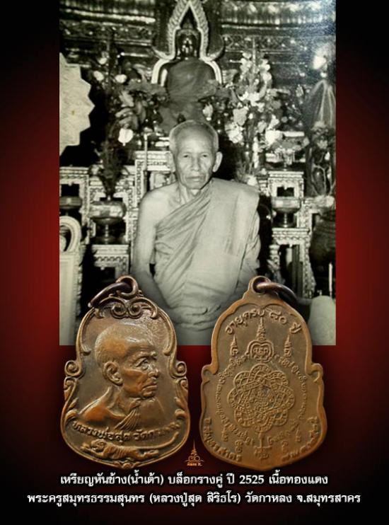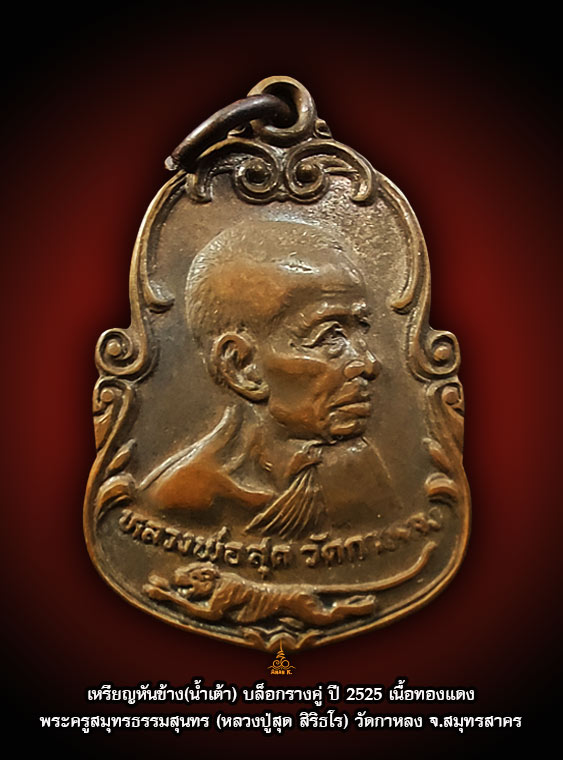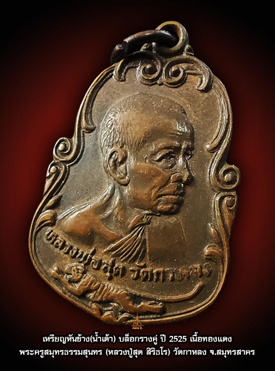 หรียญหันข้างหลวงพ่อสุด วัดกาหลง (น้ำเต้า) สร้างปี 2525 ในโอกาสที่หลวงพ่อสุดอายุครบ 80 ปี เหรียญรูปทรงน้ำเต้า ด้านหน้าเป็นรูปหลวงพ่อสุดครึ่งองค์แบบหันข้าง