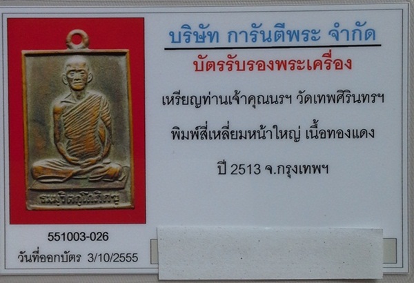 เจ้าคุณนร วัดเทพศินทร์ ปี2513 เหรียญสี่เหลี่ยมหน้าใหญ่ พร้อมบัตรรับรอง