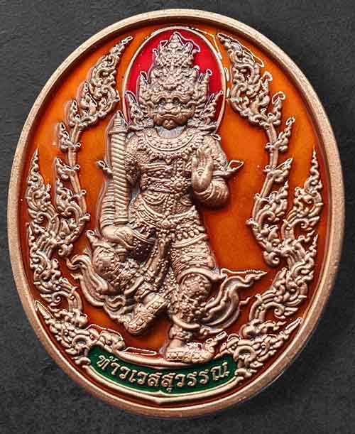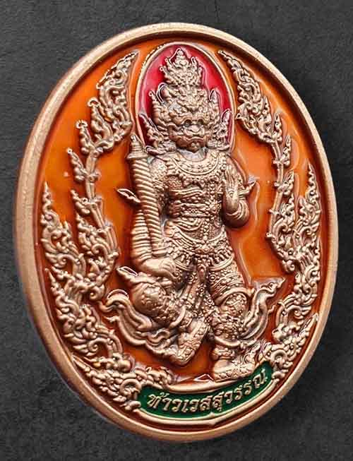 เหรียญท้าวเวสสุวรรณ รุ่น ยกฐานะ พลิกชีวิต เนื้อทองแดงซาติน ลงยาสีส้ม หมายเลข 27 เจ้าคุณพัฒน์ ปุณญกาโม วัดห้วยด้วน จังหวัด นครสวรรค์ |