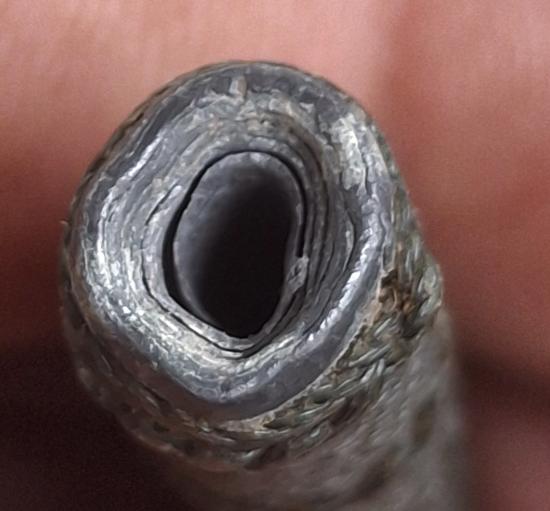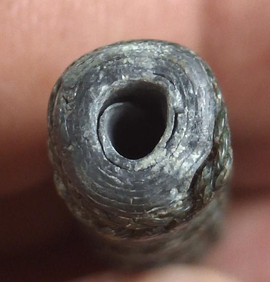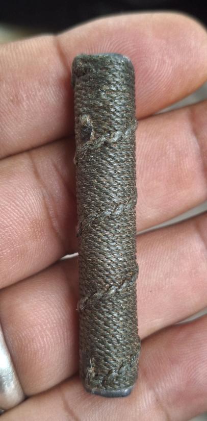 ตะกรุดเนื้อตะกั่วเก่า ถักเชือก ขนาด 2" ไม่ทราบที่ครับ |