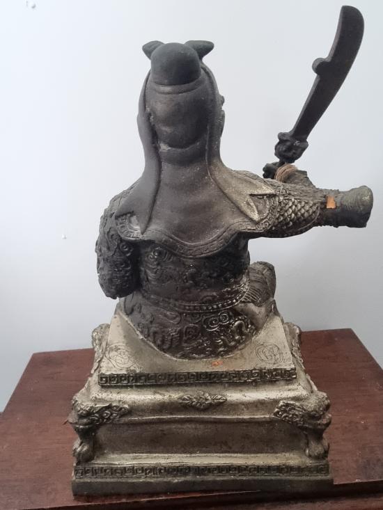 บูชาเทพเจ้ากวนอูเนื้อ สัมฤทธิ์เก่าๆผิวหิ้ง มีจาร ไม่ทราบที่ 5.5 ×10 นิ้ว