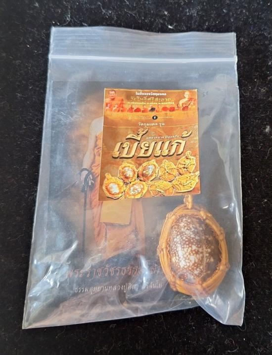 ชื่อพระเครื่อง เบี้ยแก้ หุ้มจีวร ถักเชือก หลวงปู่ศิลา วัดโพธิ์ศรีสะอาด มีแผ่นเลขกำกับ ฝังตะกรุดทองเหลือง พร้อมใบคาถา ปี2567