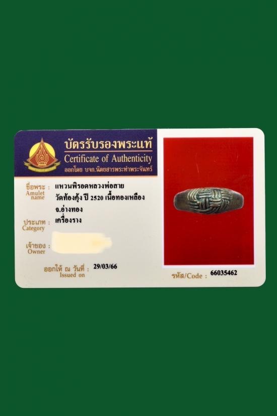 ไม่แพง เคาะเดียว แหวนพิรอดหลวงพ่อสาย วัดท้องคุ้ง เนื้อทองเหลือง ปี 2520 พร้อมบัตรรับรอง |