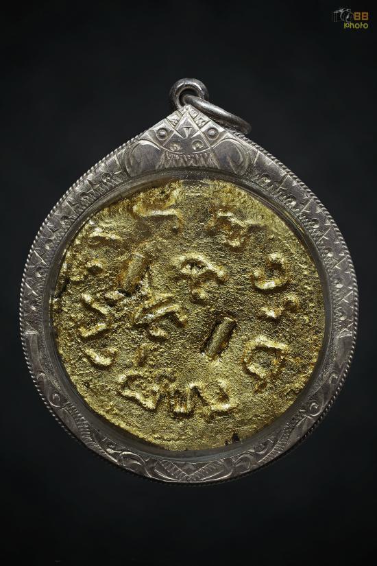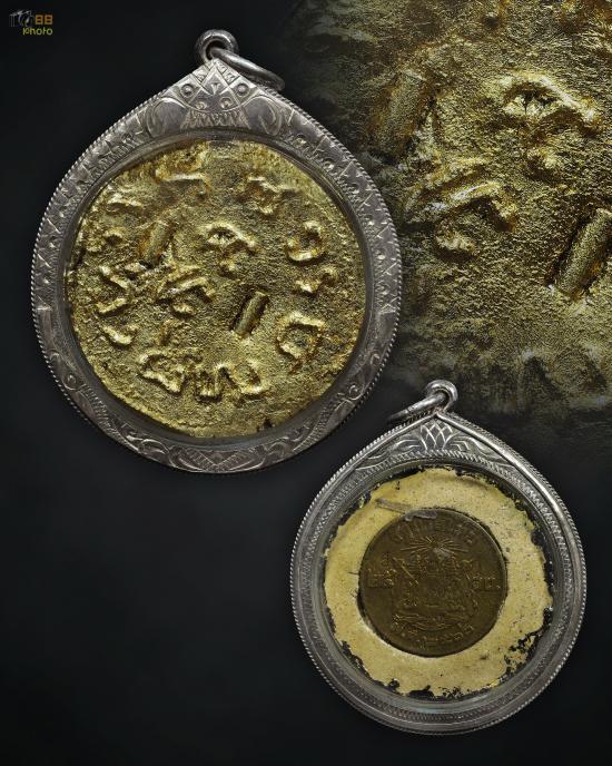 ด้านหน้าเหรียญเป็นคาถาเทพชุมนุม "อิสะวิระมะสาพุทเทวา" ฝังตะกรุดเทพชุมนุม และ ตะกรุดนะมหาเศรษฐี ด้านหลังฝังเหรียญกษาปณ์โภคทรัพย์ ตอกโค๊ตยันต์เฑาะว์ 2 จุด