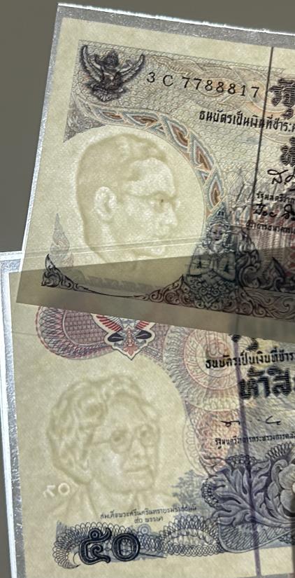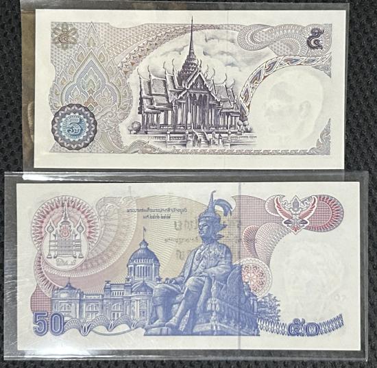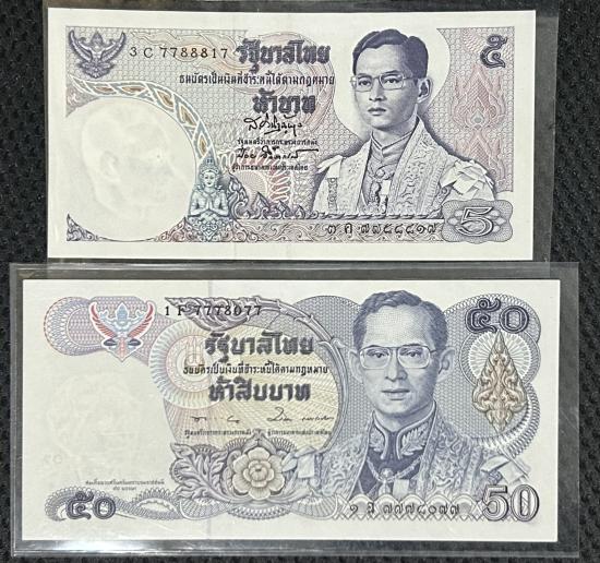 ชุดธนบัตร ร.9 ชนิด 5 บาท และ 50 บาท ไม่ผ่านการใช้งาน มีเลขตอง ทั้ง 2 ใบ