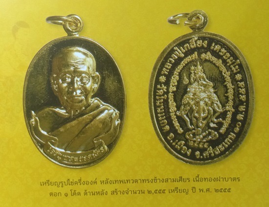 -เริ่ม 150 บาท -เหรียญรูปไข่หลังเทวดาทรงช้างสามเศียร หลวงปู่เกลี้ยง วัดโนนแกด จ.ศรีสะเกษ รุ่นเจริญพรยอดฉัตร เนื้อทองฝาบาตร หมายเลข 2234 ออกปี 55พร้อมกล่อง