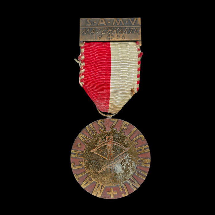 เหรียญรางวัลในภาพคือเหรียญที่ระลึกที่มอบให้ในการแข่งขันยิงหน้าไม้ ซึ่งจัดขึ้นในปี 1956 โดยสมาคมยิงปืนและยิงหน้าไม้แห่งสวิส (Schweizerischer Armbrustschützenverband หรือ S.A.M.V.)