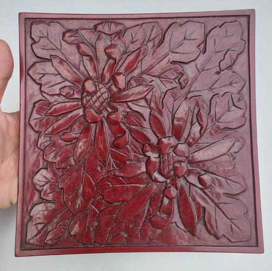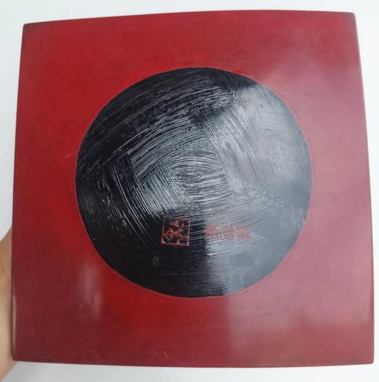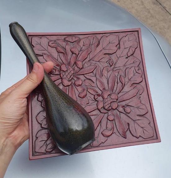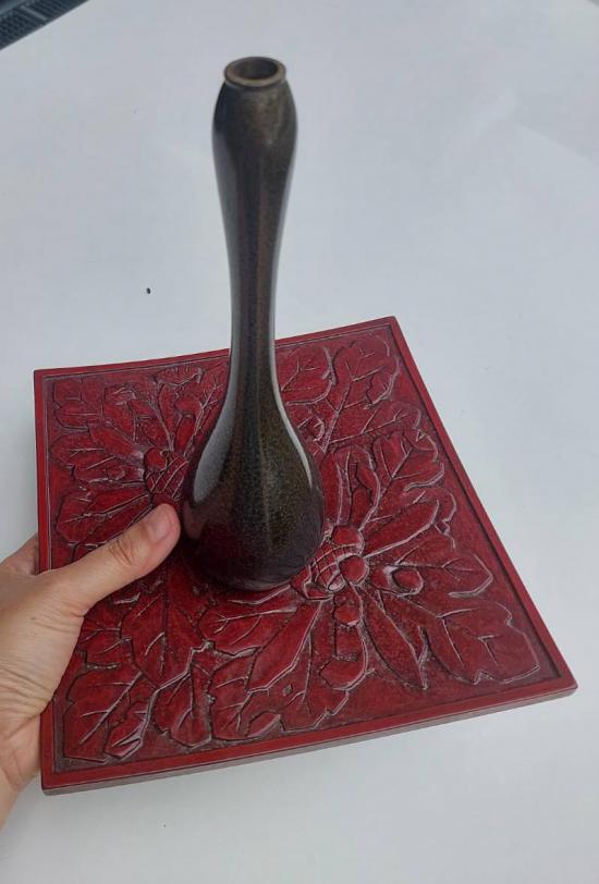 แจกันเก่าเก็บ เนื้อสำริดเคลือบผิวสีเขียวประกายทอง งานเก่าของญี่ปุ่น สูง 9.5 นิ้ว กับจานไม้แกะสลัก ขนาด 8.5 X 8.5 นิ้ว