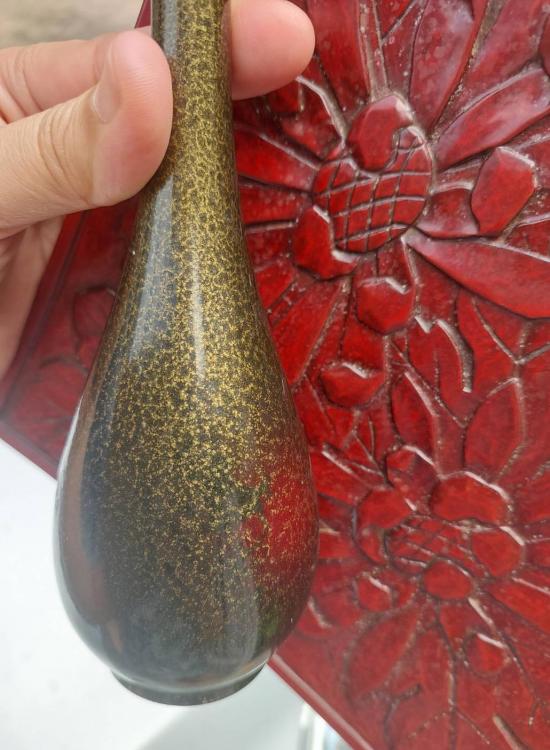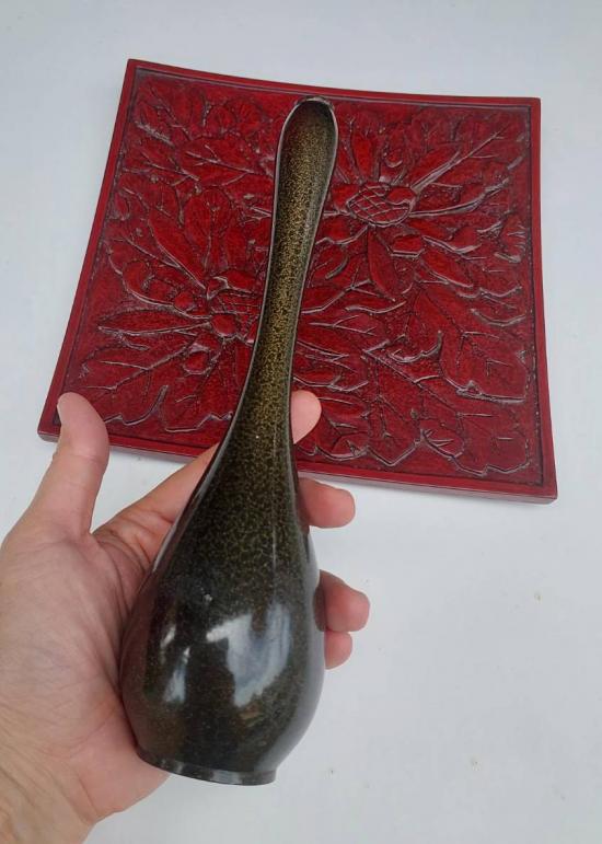 ***วัดใจ***แจกันเก่าเก็บ เนื้อสำริดเคลือบผิวสีเขียวประกายทอง งานเก่าของญี่ปุ่น สูง 9.5 นิ้ว กับจานไม้แกะสลัก ขนาด 8.5 X 8.5 นิ้ว