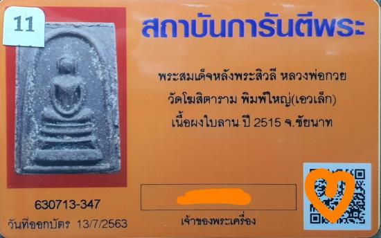 สมเด็จหลวงพ่อกวย ปี15 หลังพระสิวลี เนื้อผงใบลาน(พิมพ์ใหญ่-เอวเล็ก) วัดโฆสิตาราม จ.ชัยนาท พร้อมบัตรรับรอง |