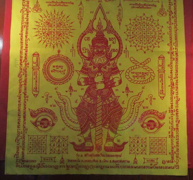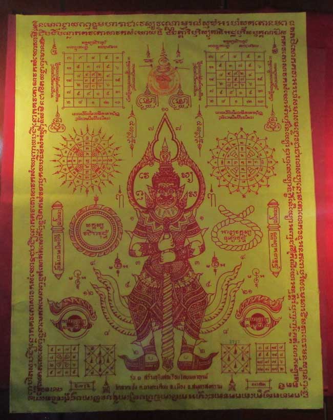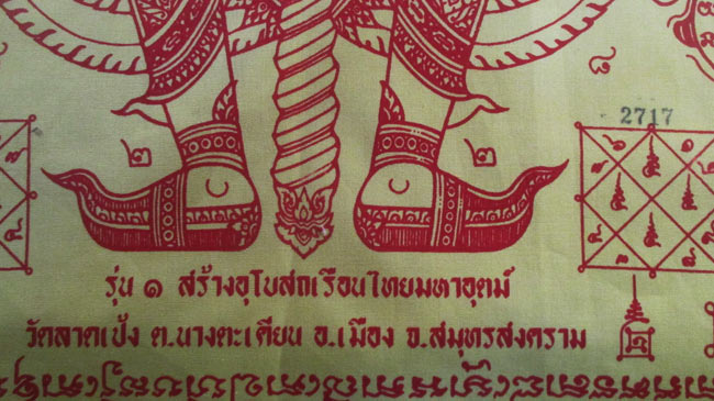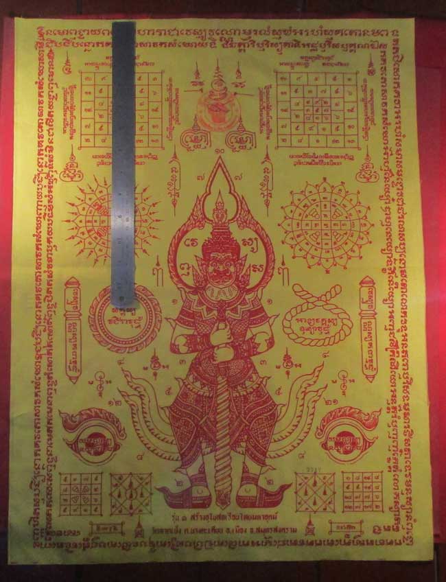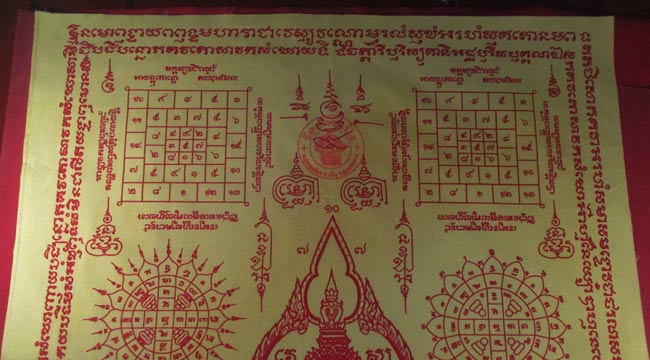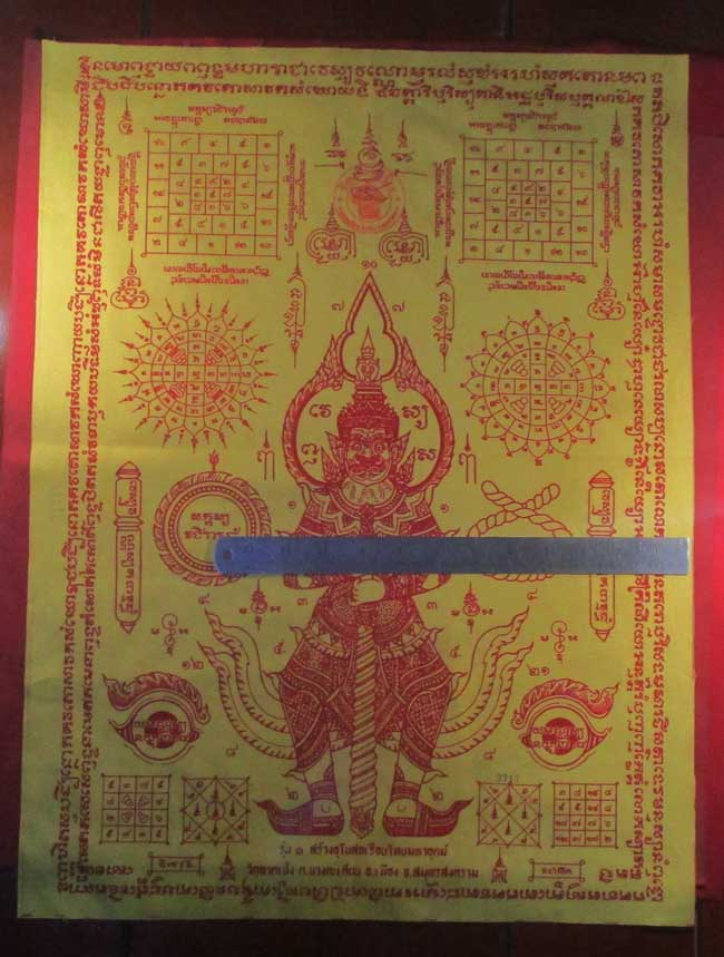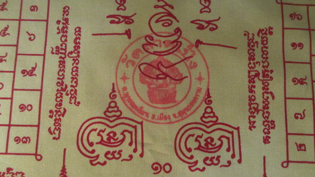 ผ้ายันต์ ท้าวเวสสุวรรณ รุ่น ๑ สร้างอุโบสถเรือนไทยมหาอุตม์ วัดลาดเป้ง ต.นางตะเคียน อ.เมือง จ.สมุทรสงคราม ครับ (สีแดง ครับ) |