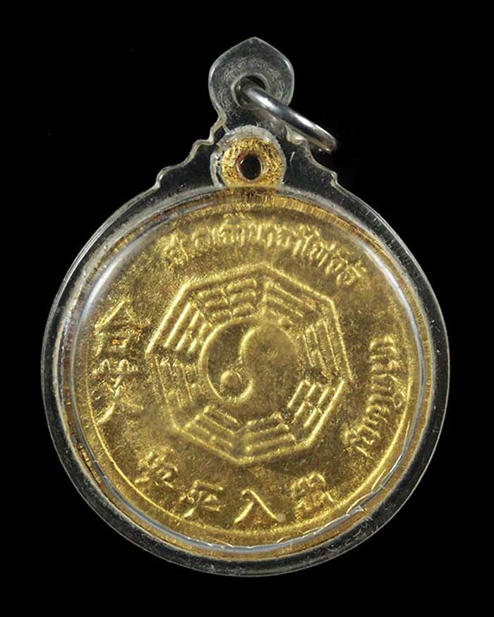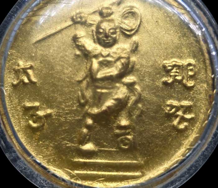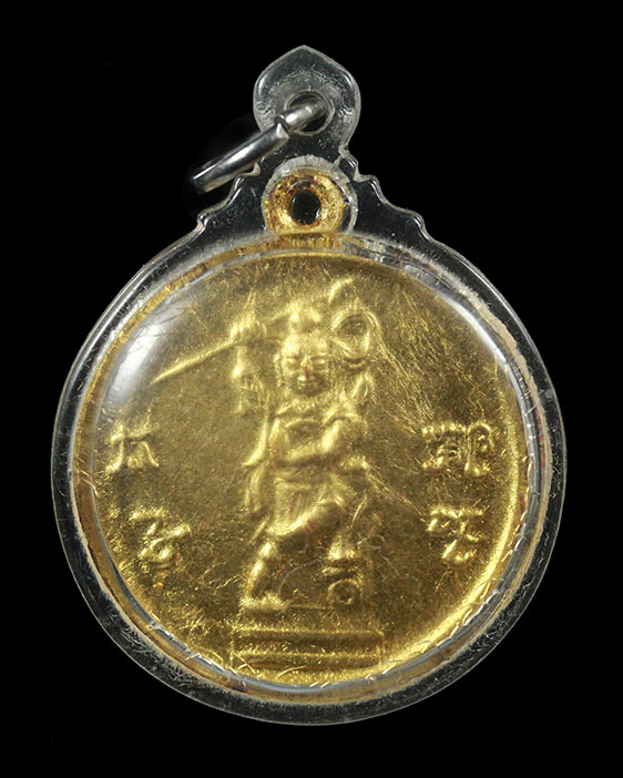 เหรียญเทพเจ้าหล่าจาซาไท้จื้อ รุ่นแรก ศาลเจ้านาจาไท้จื้อ(เนื้อทองแดงชุบกะไหล่ทองเก่า องค์นี้ปิดทองแท้มาเก่าก่อนเลี่ยม) หาดใหญ่ สงขลา