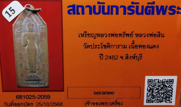 เหรียญหลวงพ่อทรัพย์ วัดประโชติการาม พิมพ์หลังหลวงพ่อสิน เนื้อทองแดง ห่วงเดิม ปี2482 จ.สิงห์บุรี + บัตรG-pra สภาพเดิมค่ะ สภาพตามรูปทุกประการค่ะ