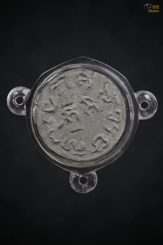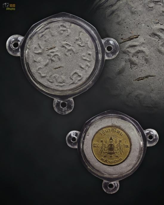 ด้านหน้าเหรียญเป็นคาถาเทพชุมนุม "อิสะวิระมะสาพุทเทวา" ฝังตะกรุดเทพชุมนุม และ ตะกรุดนะมหาเศรษฐี ด้านหลังฝังเหรียญกษาปณ์โภคทรัพย์ ตอกโค๊ตยันต์เฑาะว์ 2 จุด