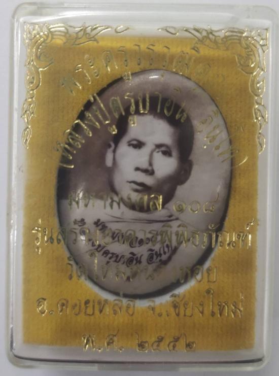 ล็อกเก็ต มหามงคล 108 ครูบาอิน อินโท วัดฟ้าหลั่ง จ.เชียงใหม่ ด้านหลังอุดผงมวลสารที่เกี่ยวเนื่องกับหลวงปู่จากเหนือจรดใต้ ได้แก่ ตะกรุดคู่ (เงิน+ทองเหลือง) ด้ายมงคลพิธีสืบชะตาหลวง, พลอยกิ๋นบ่อเสี้ยง, เกศา, จีวร และอื่นๆ