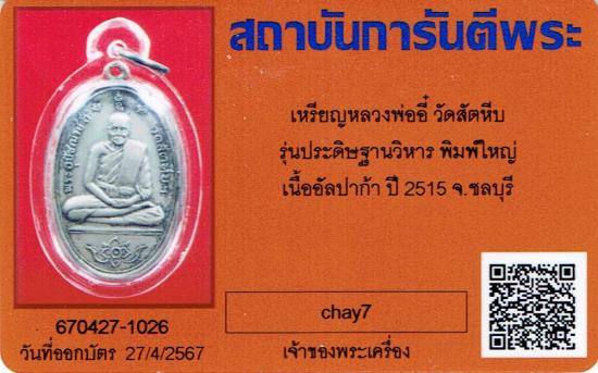 เหรียญหลวงพ่ออี๋ วัดสัตหีบ ปี 2515 พิมพ์ใหญ่(หลวงปู่ทิม วัดละหารไร่ ปลุกเสก) พร้อมบัตรรับรอง G-PRA |