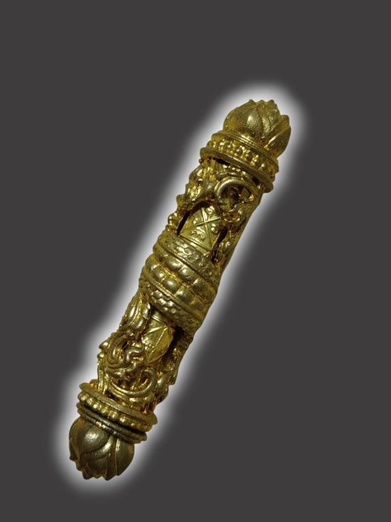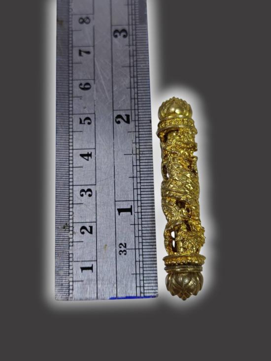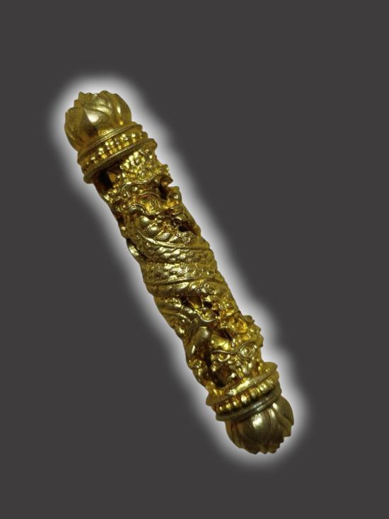 ตะกรุดมหาจักรพรรดิ์ตราธิราช สำนักประดู่ทรงธรรม จังหวัดพระนครศรีอยุธยา ปี ๒๕๕๗ ยาวประมาณ ๒.๒๐ นิ้ว มวลสารศักดิ์สิทธิ์สมเด็จพระนเรศวร เนื้อกะไหล่ทอง มหายันต์ชั้นสูงแห่งตำราพิชัยสงคราม หนุนดวง เสริมบารมี เป็นมหาอำนาจ ดุจมหาจักรพรรดิ์ เข้มขลังพลังศักดิ์สิทธิ์ อิทธิฤทธิ์แกร่งกล้าแผ่ไพศาล ตำรับเอกแห่งบูรพาจารย์ สืบสานตำนานตะกรุดไทย กรอบนอกเป็นลายตะกรุดนาคเกี้ยว นำมวลสารมาหลอมรวมกันโดยมีมวลสารสำคัญดังนี้ ผงพุทธคุณนเรศวร และผงอิฐเจดีย์สวรรคตของสมเด็จพระนเรศวร เมือง หาง ประเทศพม่า แผ่นยันต์ ๑๐๘ แผ่น ตะกรุดสายพุทธาคมหลวงพ่อกลั่น ตะกรุดสายพุทธาคมปู่ศุข ตะกรุดยันต์เกราะเพชรสายพุทธาคมหลวงพ่อปาน ตะกรุดสายพุทธาคมหลวงพ่อเงิน รูปหล่อลอยองค์สมเด็จโตฯ เหรียญไพรีพินาศ สมเด็จฯ พระสังฆราช พระกริ่งนเรศวรรุ่นต่างๆ ภายในบรรจุตะกรุดยันต์มหาจักพรรดิ์ตราธิราช พิธีใหญ่ตามตำราตะกรุดสำนักประดู่ทรงธรรม ปลุกเสก อธิษฐานจิต วัตถุมงคล โดยสุดยอดเกจิอาจารย์สายพุทธาคมสำนักประดู่ทรงธรรม หลวงปู่ทองหล่อ วัดโปรดสัตว์ พระนครศรีอยุธยา หลวงพ่อผิว วัดประดู่ทรงธรรม พระนครศรีอยุธยา หลวงพ่อเฉลิม วัดพระญาติการาม พระนครศรีอยุธยา หลวงพ่อพูน วัดบ้านแพน พระนครศรีอยุธยา พระอาจารย์วสันต์ วัดไทรม้าใต้ นนทบุรี พุทธคุณเด่นด้าน คงกระพัน มหาอุตม์ โชคลาภ เสริมดวง ต่อชะตา เมตตา ค้าขาย