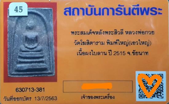 สมเด็จหลวงพ่อกวย ปี15 หลังพระสิวลี เนื้อผงใบลาน(พิมพ์ใหญ่-เอวใหญ่) วัดโฆสิตาราม จ.ชัยนาท พร้อมบัตรรับรอง |