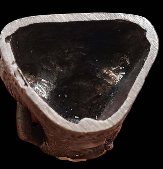พระบูชาหน้ารถหลวงพ่อกลั่น วัดพระญาติการาม ออกวัดราษฎร์บรรจง (วัดตาดง) กรุงเก่า ขนาดหน้าตัก 1.5 นิ้ว เนื้อรมดำ