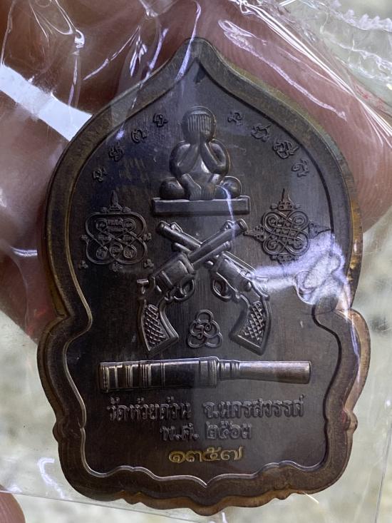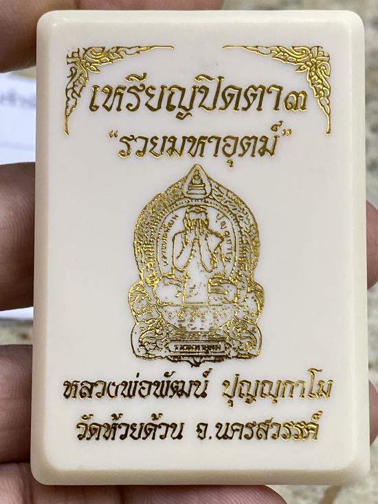 เหรียญปิดตา3 หลังปืนไขว้ รุ่น รวยมหาอุตม์ หลวงพ่อพัฒน์ วัดห้วยด้วน นครสวรรค์ เนื้อนวะไม่ตัดปีก เลข 1357 กล่อง |