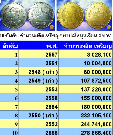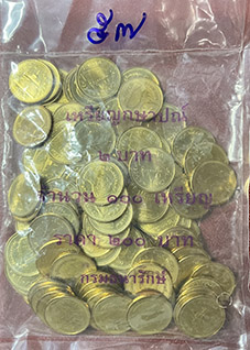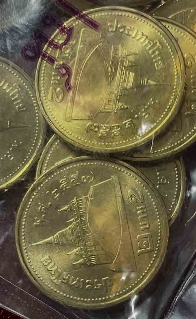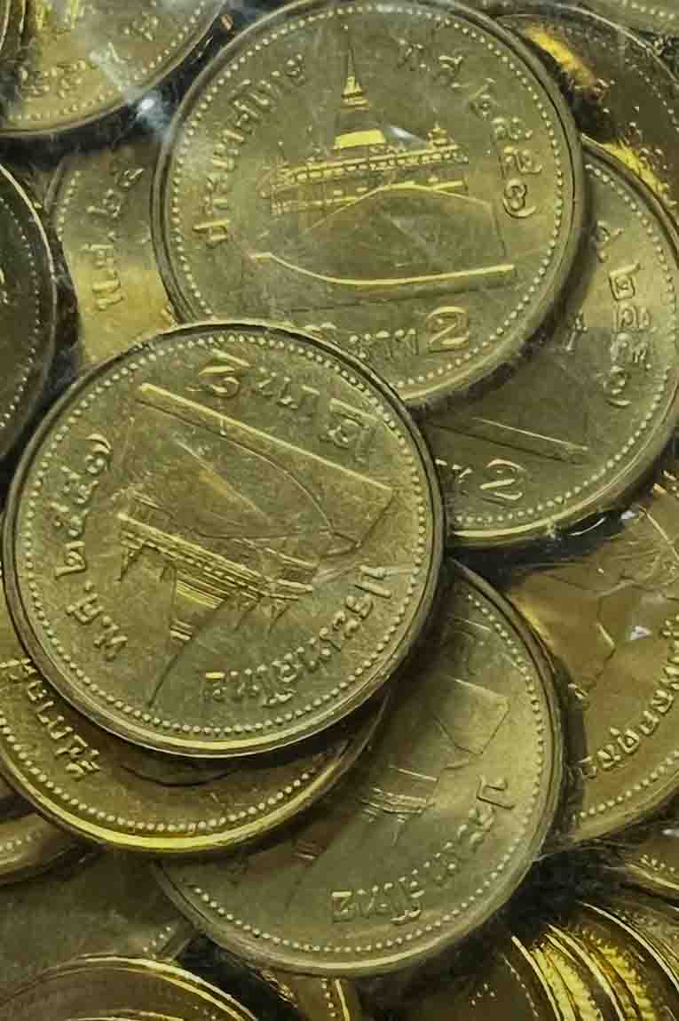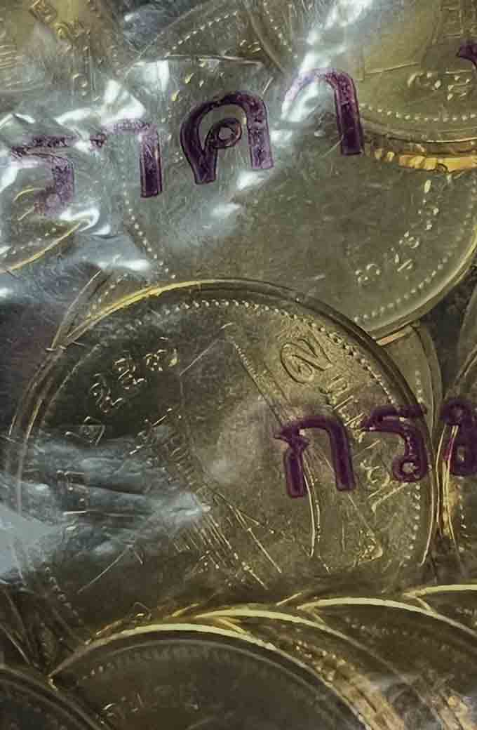 เหรียญ ๒ บาท หมุนเวียนสีทอง ปี ๒๕๕๗ ถุงเดิม UNC ผลิตน้อยที่สุด |