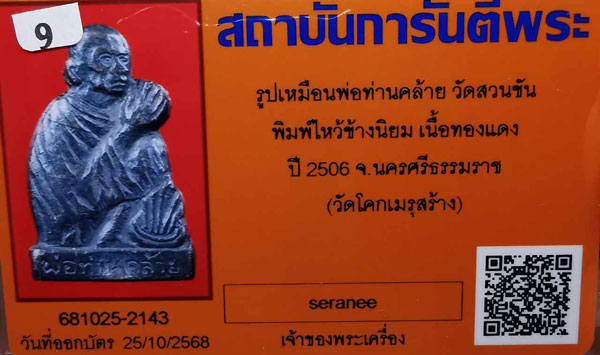 รูปเหมือนพ่อท่านคล้าย วัดสวนขัน พิมพ์ไหว้ข้างนิยม เนื้อทองแดง กริ่งดัง ปี2506 จ.นครศรีธรรมราช (วัดโคกเมรุสร้าง) + บัตรG-pra สภาพสวยเดิมค่ะ |