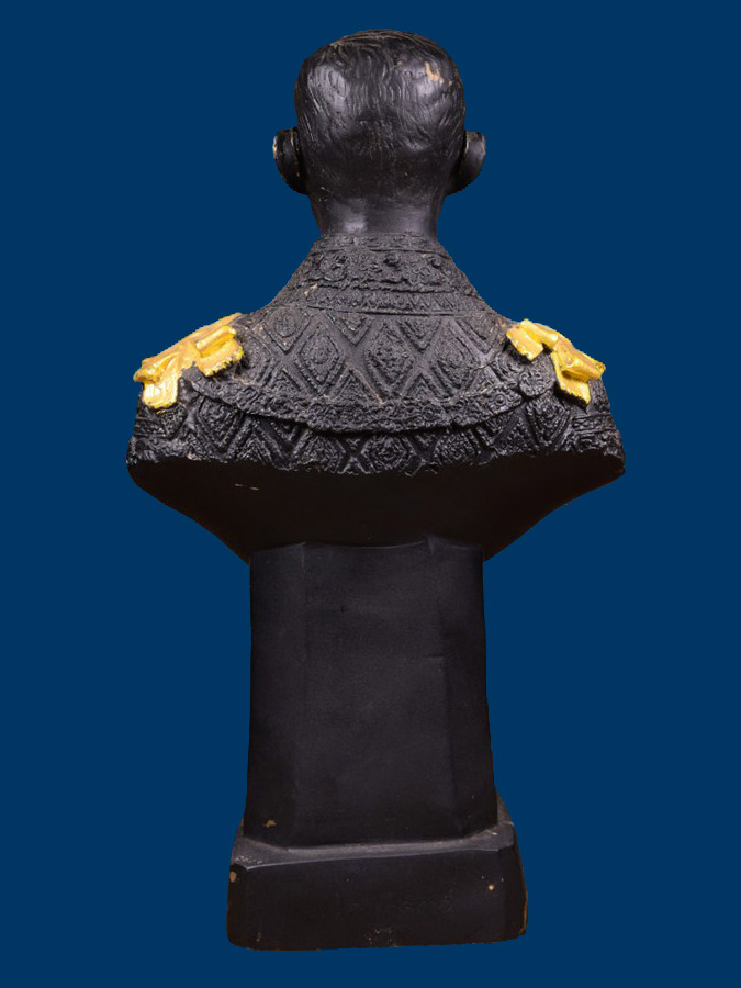 พระบรมรูปจำลองพระบาทสมเด็จพระเจ้าอยู่หัว รัชการที่ ๙ เนื้อโลหะ จัดสร้างโดยกรมทนารักษ์ ปี 2530 หมายเลข 0199 สูง 14 นิ้ว กว้าง 8 นิ้ว