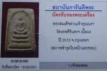 พระสมเด็จผงขมิ้น ท่านเจ้าคุณนรฯ วัดเทพศิรินทรฯ เนื้อผง ปี2513 พร้อมบัตรรับรองครับ