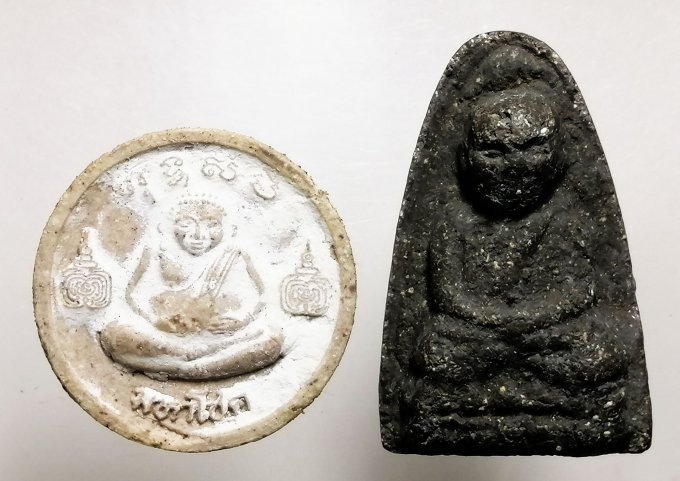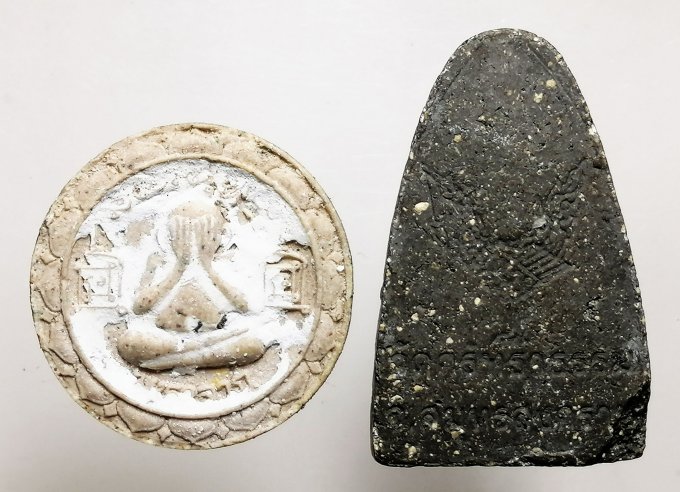 1. พระพิมพ์จันทร์ลอย ด้านหน้ารูป พระสังกจายย์ มหาโชค ด้านหลัง พระปิดตา มหาลาภ ฝังเม็ดพระธาตุ ออกที่วัดหลักเมืองพัฒนาราม จ.เพชรบูรณ์ (พิมพ์นี้พบเจอน้อย ไม่ค่อยมีให้เห็น) สภาพสวย หลวงปู่หมุน ปลุกเสก มีแป้งเจิมทั้งหน้า-หลัง