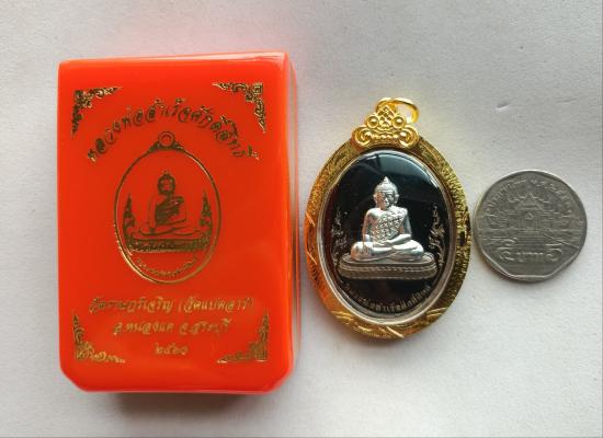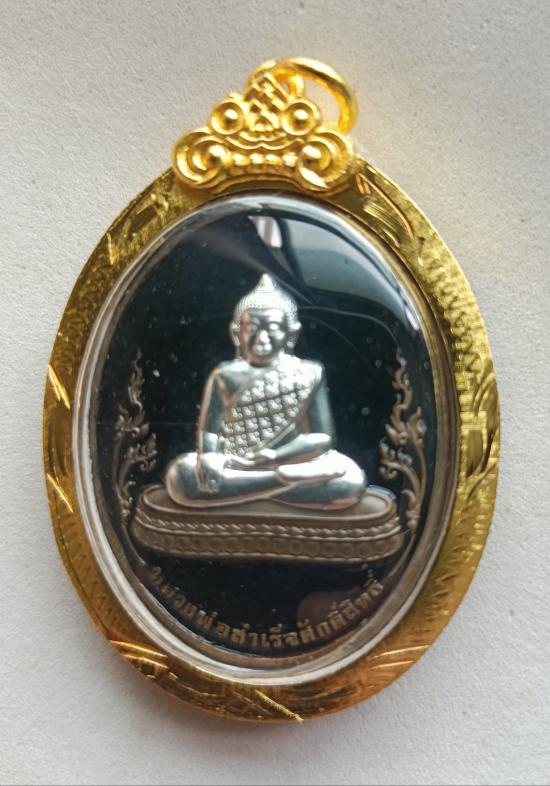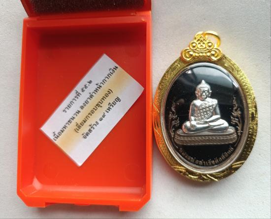 วัดใจเคาะเดียวแดงจ้า เหรียญหลวงพ่อสำเร็จศักดิ์สิทธิ์ เนื้อมหาชนวนลงยาดำหน้ากากเงิน เลี่ยมกรอบชุบทอง สร้าง19เหรียญ องค์นี้หมายเลข12 เคาะเดียวแดงจ้า
