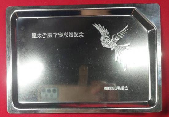กับถาดสแตนเลส ที่รำลึกพระราชพิธีเสกสมรสของสมเด็จพระจักรพรรดิอากิฮิโตะ ญี่ปุ่น ขนาด 3 x 6.5 นิ้ว
