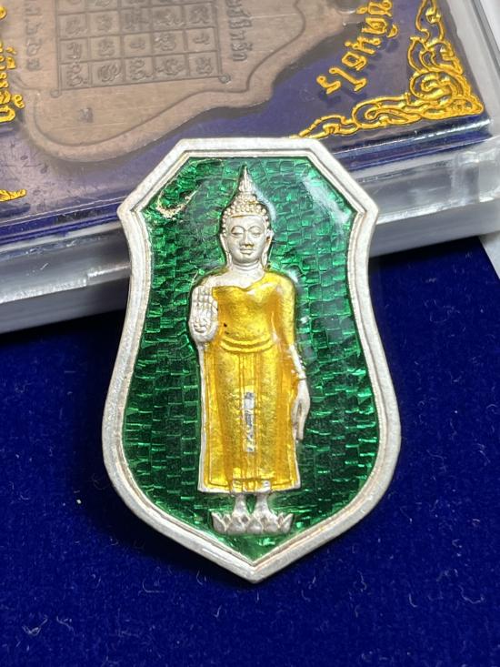 เคาะเดียวแดง เหรียญหลวงพ่อธรรมจักร วัดธรรมมามูล จังหวัดชัยนาท เนื้อเงินลงยา สีเขียว ปี2540