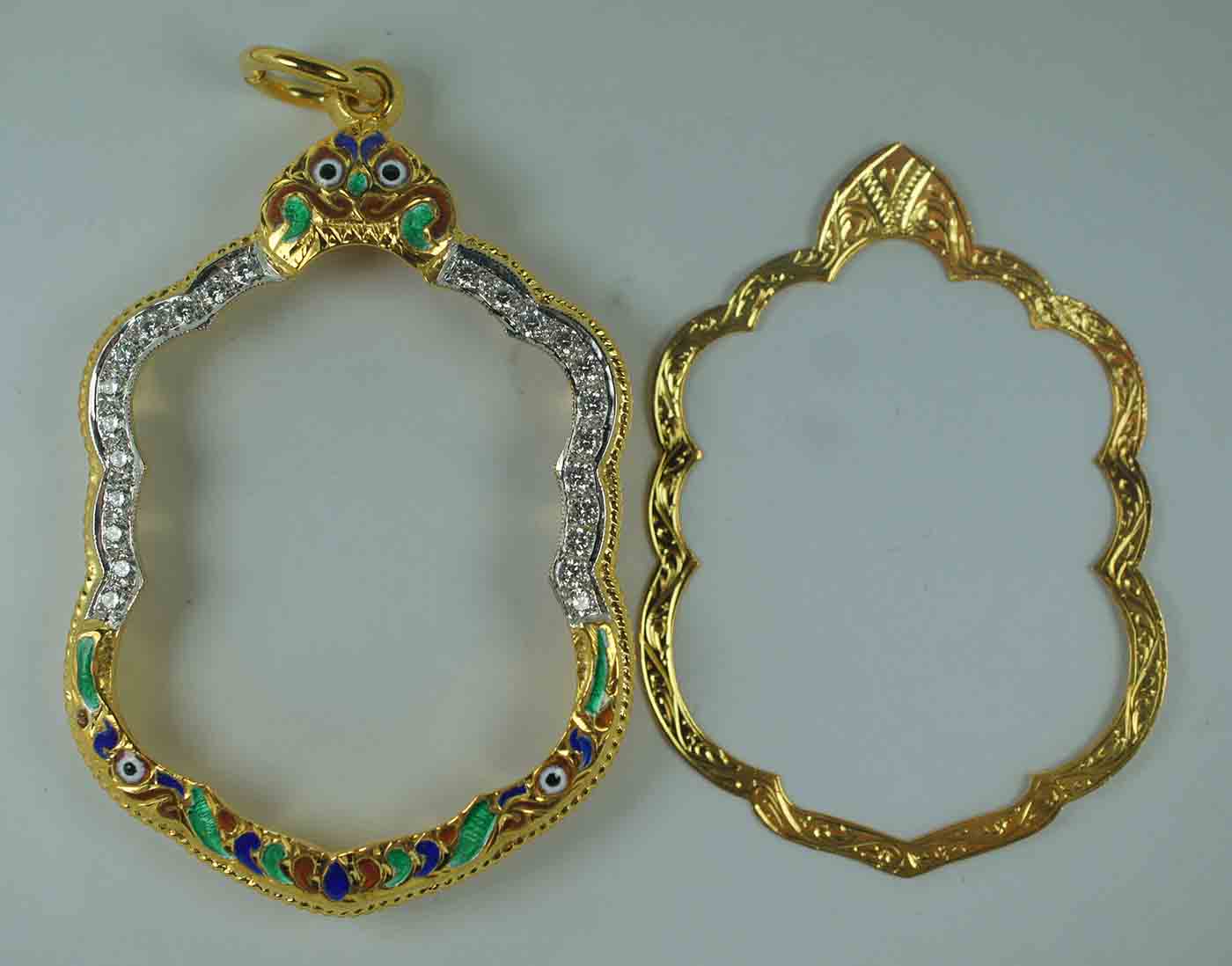 งานกรอบเงินแท้ ( มือหนึ่ง ) ชุบทองแท้ ใส่เหรียญ เสมา หลวงปู่ทิม หรือขนาดไกล้เคียง ยกซุ้ม หัวสิงห์ ฝังเพชร CZ ข้างเกลียวโปเต้ ยับทราย งานขึ้นมือ ( มาตรฐานงานตัวเดียวกับกรอบทองคำแท้ ) น้ำหนัก 10.06 กรัม ฝังเพชร CZ 24 เม็ด การันตรีโดยศรีเมืองระยอง พระเครื่อง |