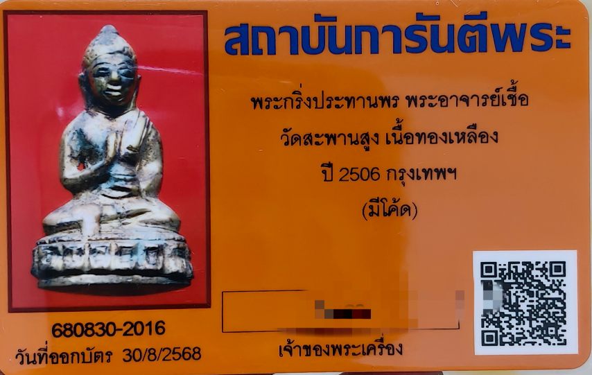 พระกริ่งประทานพร พระอาจารย์เชื้อ วัดสะพานสูง เนื้อทองเหลือง ปี2506 กรุงเทพฯ มีโค๊ต+บัตรับรอง