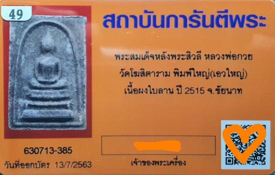 สมเด็จหลวงพ่อกวย ปี15 หลังพระสิวลี เนื้อผงใบลาน(พิมพ์ใหญ่-เอวใหญ่) วัดโฆสิตาราม จ.ชัยนาท พร้อมบัตรรับรอง