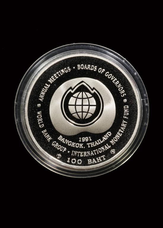 เหรียญกษาปณ์ชนิด 100 บาท ในหลวงร.9-พระราชินี ที่ระลึกเนื่องในการประชุมสภาผู้ว่าการธนาคารโลก WORLD BANK ปี2534 (((เนื้อนิกเกิล ขัดเงา))) เก่าเก็บ ไม่ผ่านใช้