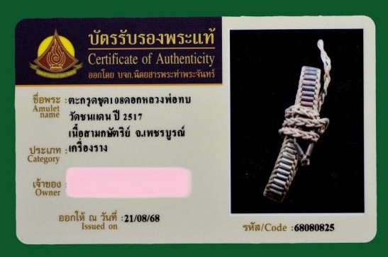 ตะกรุดชุด108ดอกหลวงพ่อทบ วัดชนแดน จ.เพชรบูรณ์ เนื้อสามกษัตริย์ ถักเชือก สร้างปี 2517 บัตรรับรองนิตยสารพระท่าพระจันทร์